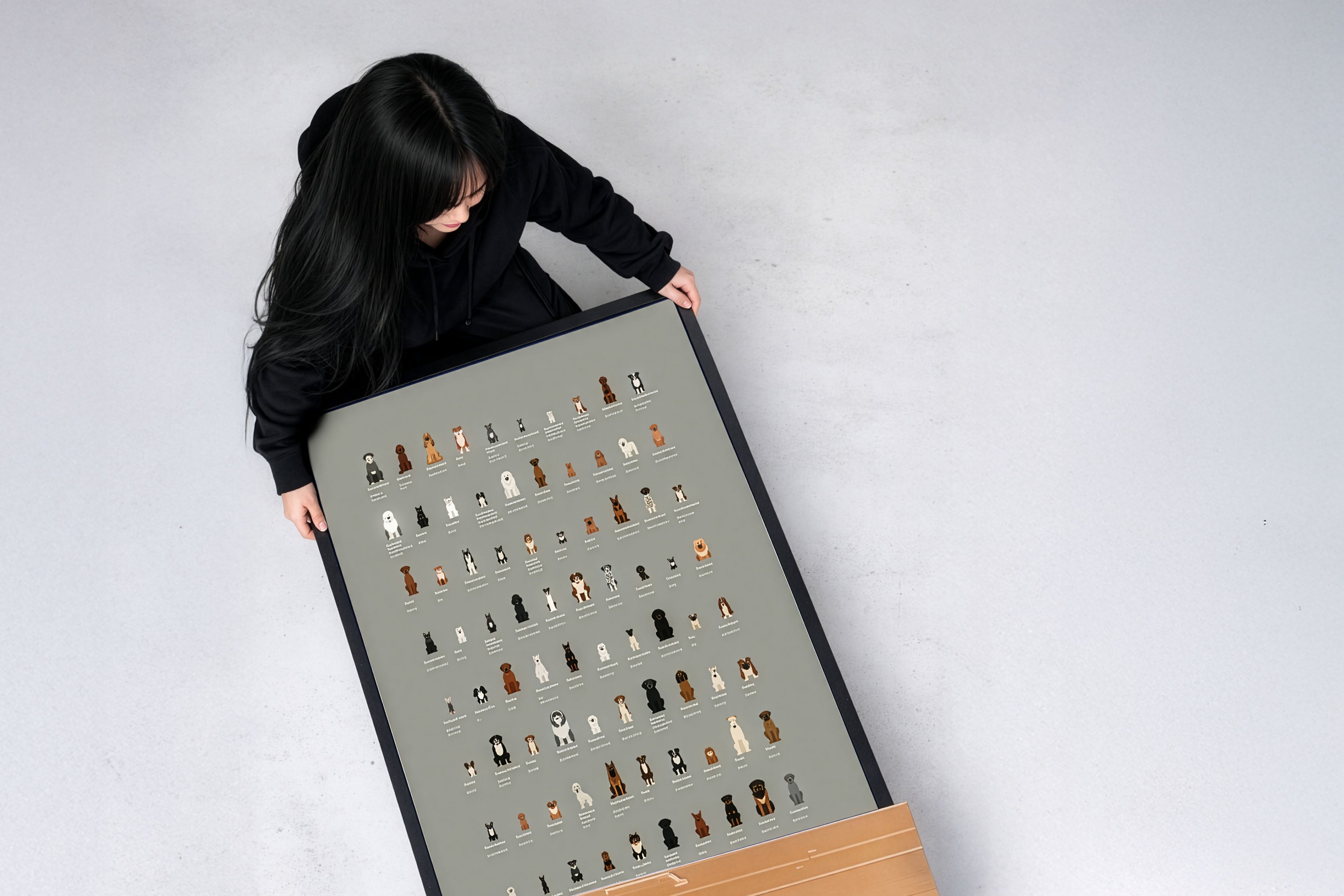 多様性と秩序が共存するとき、そこには心地よい調和が生まれます。「80 DOGS JP」は、世界に数多く存在する犬種の中から80種を選び、その姿と個性を一枚のポスターとして編み上げました。